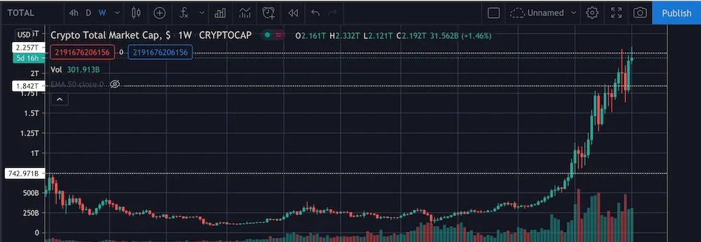 What is crypto market cap? In hitting its new historical high, the total crypto market capitalization has overtaken the market cap of oil and gas giant saudi aramco, the world's second most valuable. Котировки total crypto market cap. The top 5 cryptocurrencies with the highest increase in price. All assets, including public companies, precious metals, cryptocurrencies, etfs. How much does total crypto market cap cost? Today, we have the highest volume, bear volume/red, since february 2021. Total market capitalization (excluding bitcoin). Total crypto market capitalization, volume charts and global cryptocurrency overview. All time high (ath) price falling, dates, and hits. A complete crypto market overview. The stock symbol or ticker of total crypto market cap token is tcap. Daily high / daily low.